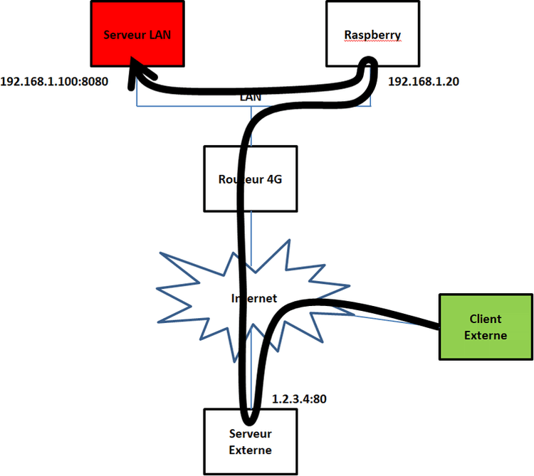 La connexion au port externe du serveur 80 est redirigée par son SSH vers le Raspberry Pi par le tunnel sécurisé.