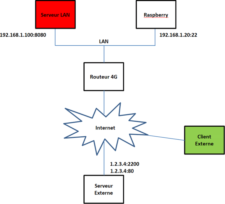 - Raspberry Pi sur le LAN : 192.168.1.20 avec SSH sur le port 22;