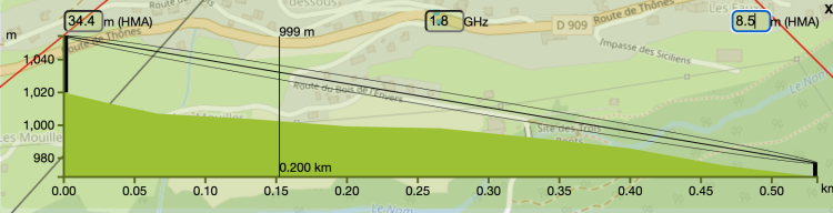 En effet, du premier étage de mon domicile, le pylône est à vu et l'orientation communiquée est celle avec le pylône en référence (axe pylône/domicile). Le seule "point noir" c'est que le pylône ne semble pas encore fibrée. Sa liaison est hertzienne (profil altimétrique montagneux). Ci dessous la simulation de mon profil altimétrique à jour avec une distance pylône/domicile estimée à 0,53 Km et 19° de décalage par rapport à la position de l'antenne Bouygues sur le pylône le plus proche.