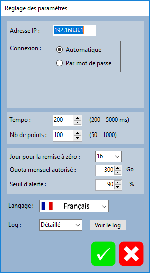 Si possible, faire un test de débit pour les trois tests.Sur la barre d'état en bas du programme, en quatrième position, tu peux voir l'indication de l'agrégation des deux bandes de fréquence : le nombre "44" (comme sur ta copie d'écran de LTE-Watch)NB : la dernière version de LTEInspecteur, disponible en version portable, te permet d'accéder plus facilement au fichiers log. Avant de faire tes tests, il faut choisir l'option "détaillé" pour le fichier log :